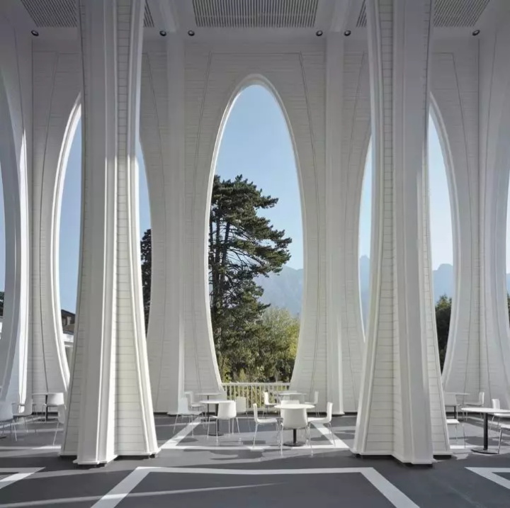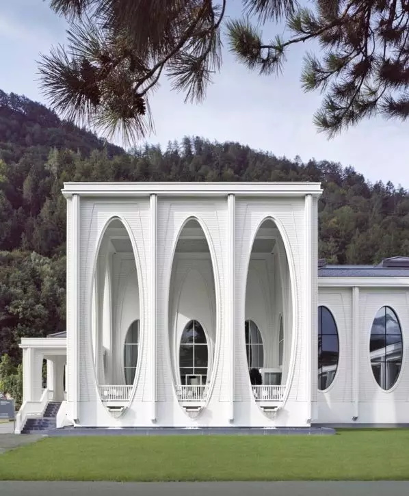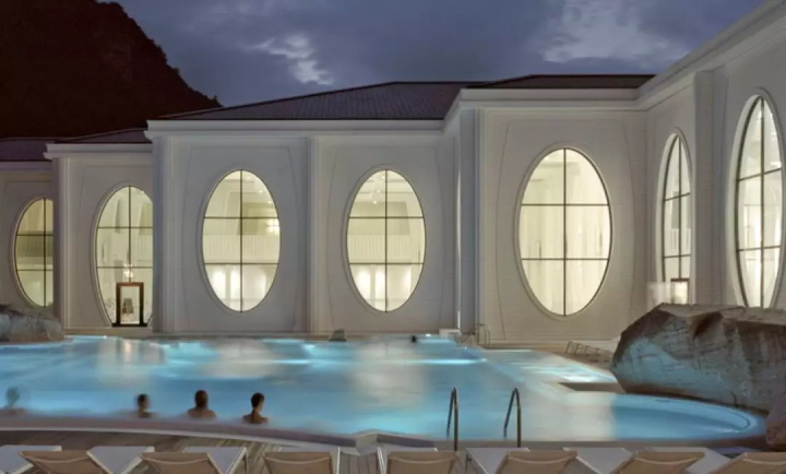 溫泉浴場(chǎng)屬于大酒店的一部分,因此文化和審美具有傳統(tǒng)上的同一性:放松,親和。建筑非常具象,就是一個(gè)地道的建筑物,內(nèi)部用涂成白色的木材替代“城市”中的石柱子。同時(shí)建筑顯眼的橢圓形窗口讓景觀(guān)更優(yōu)縱深感,并充滿(mǎn)了維多利亞時(shí)代感,這算是對(duì)環(huán)境景觀(guān)應(yīng)對(duì)的一個(gè)中立性態(tài)度。