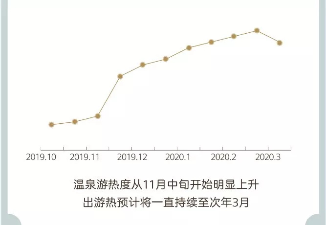 每年11月至次年2月是溫泉度假消費需求的旺季。隨著氣溫走低,溫泉游產品銷售進入持續火爆期,預訂出游人次從11月中旬開始明顯上升,出游熱預計將一直持續至次年3月。11月至12月,年末“年假清零”等因素影響將明顯促使“泡湯”升溫。